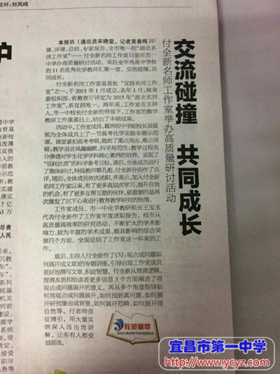 付全新名师工作室是首批“宜昌名师工作室”之一,于2015年1月成立,去年1月,被省委组织部、省教育厅评定为2015年“湖北名师工作室”,系宜昌唯一。两年来,工作室在主持人、市一中校长付全新的带领下,工作室的教学教研工作蒸蒸日上,结出了丰硕成果。