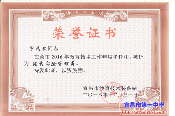 近日,从市教育技术装备站获悉,我校荣获全市“2016年度教育技术工作先进学校”荣誉称号,曾凡武老师在全市2016年教育技术工作年度考评中,被评为“优秀实验管理员”。
