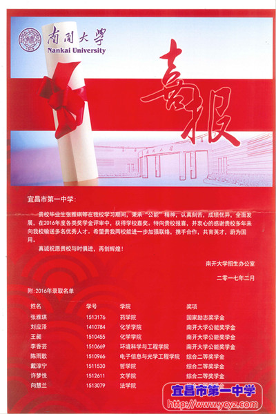 近日,我校收到南开大学发来的喜报。《喜报》称,我校多名毕业生在南开大学2016年度各类奖学金评审中,获得学校嘉奖。