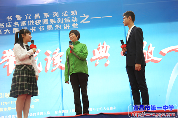 经典蕴含丰富的文化积淀和人性内涵,经典点燃我们心灵深处的理想火焰。5月12日,我校第六届读书节迎来重磅活动——“名家带我读经典:敬一丹”,央视著名主持人敬一丹专程来宜对话我校千名师生,讲述自己的读书经历,分享阅读文学经典的体会和感悟,传递阅读带来的力量和幸福。湖北省新华书店集团公司副总经理时军,北京长江新世纪传媒公司主任周轶,宜昌市新华书店总经理高斌,宜昌市文联副主席卢进,宜昌市作协副主席冯汉斌等领导,我校校长付全新,党委书记蒋含丹及我校全体高一年级师生、来自宜昌各初中学校的优秀学生代表近两千人参加此次活动。