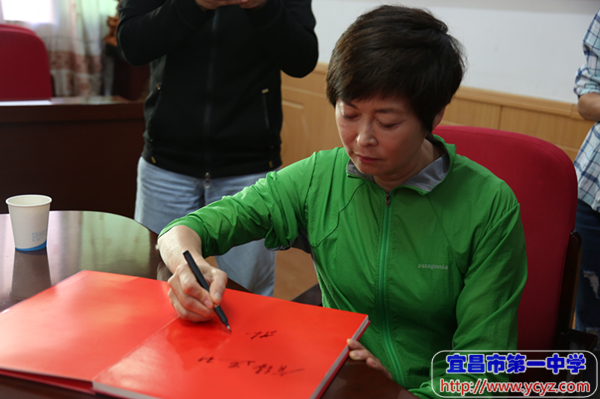 校长付全新对敬一丹老师的到来表示了热烈的欢迎,并陪同敬老师参观我校校园。当来到我校图书馆门口看到2016届高三毕业生三年阅读书目时,敬老师极为惊叹,一边拿出手机拍照,一边对一中学子热爱阅读的品质大加赞赏:“看了这么多书,涉猎这么广泛,难怪他们都考上了一流大学!”来到我校二楼会议室,敬老师接受了来自湖北、宜昌等多家媒体的现场采访,分享了自己的阅读经验,采访中,她多次称赞“一中学生的读书涉猎让人惊讶”。