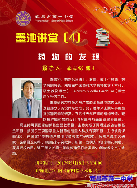 5月18日,中国药科大学药学院副院长、博士生导师李志裕教授为我校高二年级理科班学生作了一场“药物的发现”的科普报告,副校长李大海主持热情接待并致欢迎辞。