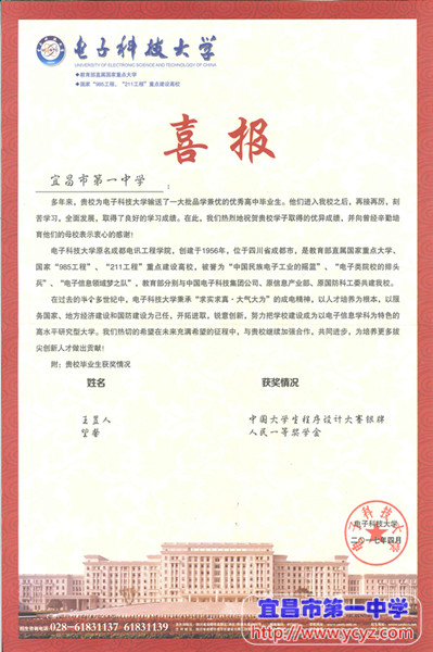 近日,我校收到电子科技大发来的喜报。电子科大感谢我校多年来输送了一大批品学兼优的学子进入科大深造,这些学生在大学期间,刻苦学习,全面发展,在各个方面均取得了优异成绩:崔煜凡、王昱人和望馨等同学,分别获得“人民特等奖”、“人民一等奖”;崔煜凡同学还获得“西门子工业设计竞赛华中赛区二等奖”;王昱人同学获得“中国大学生程序设计大赛银牌”。电子科大希望双方在未来继续加强合作,共同进步,为培养更多拔尖创新人才做出贡献。