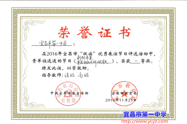 在宜昌市委宣传部、宜昌市教育局联合举办的2016年宜昌市“双读”优质课评比活动中,我校熊剑老师所执教的《廉颇蔺相如列传》语文课,荣获得一等奖。我校谈怡、高皓两位老师指导的《新制布裘:茅屋为秋风所破歌》被评为“双读”优秀展演节目一等奖。