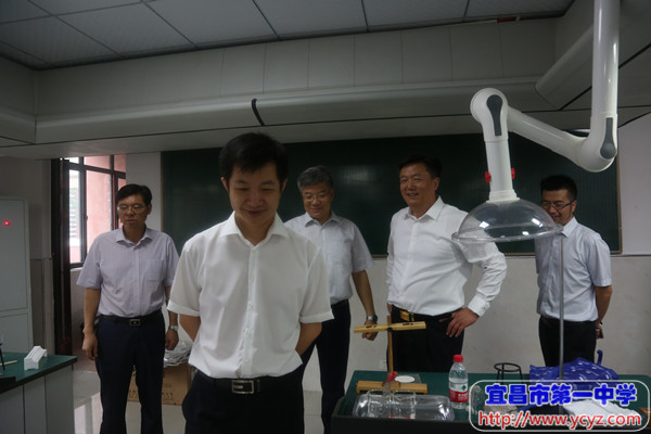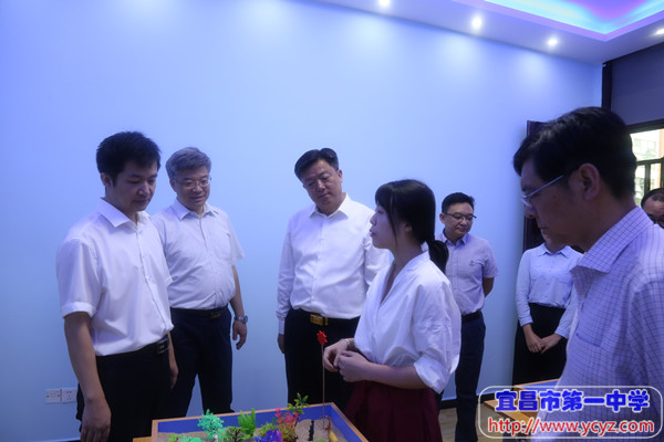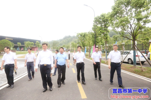 市教育局党组成员、市委高工委专职副书记翟秀刚(左二),校长付全新(左三),点军区委副书记、区长 高杰(左四),宜昌市人民政府副市长、党组成员唐超(左五),校党委书记陈鹏(左六),市教育局党组书记、局长覃照(左七)