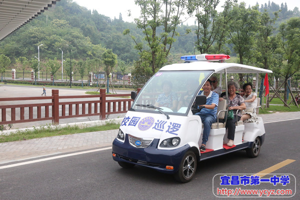 校园巡逻车带领行动不便的老教师参观