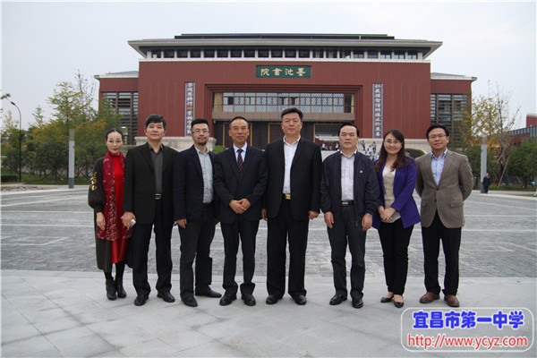 合影留念:宜昌市招考办副主任李群(左一)、宜昌市招考办主任周建平(左二)、宜昌一中党委书记陈鹏(左三),香港中文大学校长徐扬生(左四),宜昌一中校长付全新(左五),省招办副主任周则顺(左六),香港中文大学招生就业处副处长、湖北招生组组长马明霞(右二),香港中文大学学术交流处处长柯常青(右一)