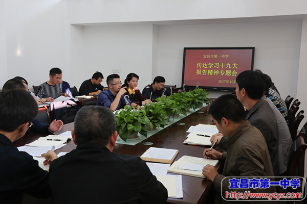 陈鹏同志首先介绍了宜昌市传达学习党的十九大精神会议重要指示,市委书记周霁传达了党的十九大报告精神、十八届中央纪委工作报告和党章修正案的主要精神、习近平总书记在参加贵州省代表团讨论时的重要讲话精神和湖北省传达学习党的十九大精神会议的主要精神。周霁同志强调要推动十九大精神宣传教育入脑入心;把“四个意识”落实在岗位上、落实到行动上;坚持用习近平新时代中国特色社会主义思想武装头脑、指导实践、推动工作;始终牢记习近平总书记的殷殷嘱托;坚决落实管党治党政治责任。