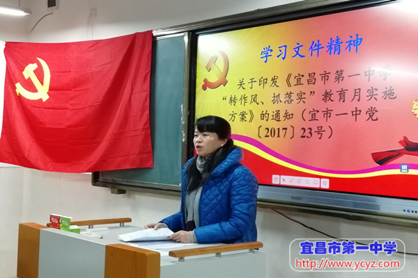 根据市委办公室、市政府办公室《关于深入推进转作风抓落实的通知》和市教育局《全市教育系统深入推进转作风抓落实工作方案》,以及我校“转作风、抓落实”教育月活动方案等文件的精神和要求。我支部书记蔡利鹏同志结合本支部的实际情况,严格按照“查、晒、督、考、处”五个字的思路和方法,全面开展工作,力争使教师的工作作风向“严紧硬实”再迈进一步。接着,纪委书记王桃同志对“转作风、抓落实”的工作提出具体要求:1.坚持以上率下,层层践行;2.坚持问题导向,建立长效机制;3.坚持从严执纪,不姑息不迁就,稳扎稳打。