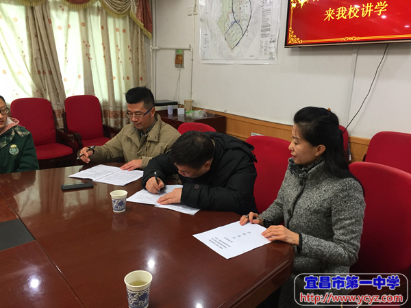 陈鹏书记代表学校致欢迎辞后,诸葛教授、包岩女士、陈鹏书记分别代表中国人民大学国学院、中国出版传媒中版文化、宜昌市第一中学签订了《国学教育合作协议》,授予我校“中国人民大学中小学国学教育基地·全国中学生国学大赛暨国学等级考试优质生源地”资质并颁发铜牌,三方将在基地校与优质生源地的基础上共同推进国学教育之开展。
