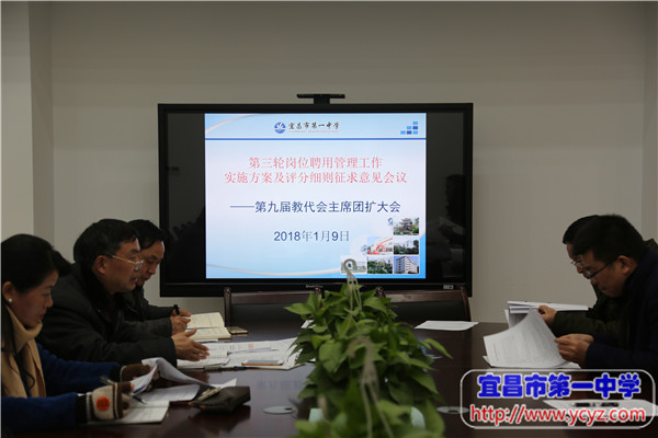 2018年1月10日,我校召开第三轮岗位聘用管理工作实施方案及评分细则征求意见会议,出席本次会议的有学校教代会主席团全体成员以及随机抽选的九位教师代表。