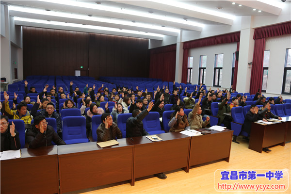 闭幕式由副校长李大海同志主持。大会秘书处林绍华同志、高皓同志、贺飙同志首先就各项文件草案修改修正情况作了详细说明,工会主席郭永寿同志就工会工作报告作修改说明,与会代表分别就《宜昌市第一中学发展规划纲要2018-2022(讨论稿)》、《宜昌市第一中学章程(讨论稿)》、《宜昌市第一中学第三轮岗位聘用工作方案及评分细则(讨论稿)》举手表决,监票人、教师代表上台报告表决结果,李大海校长宣布表决通过。