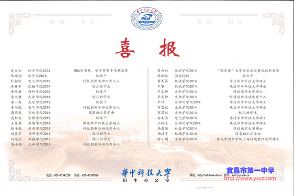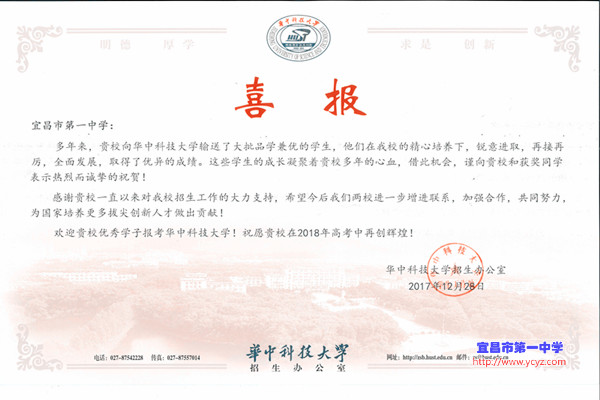 近日,我校收到华中科技大学发来的喜报。喜报称,我校多年来向华中科技大学输送了大批品学兼优的学生。这些学生在华科大的精心培养下,锐意进取,再接再厉,全面发展,取得了优异的成绩。他们的成长凝聚了宜昌一中多年的心血,借此机会,谨向我校和获奖同学表示热烈而诚挚的祝贺!