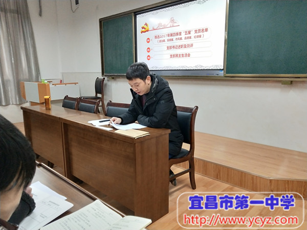 高二支部举行一月支部党日活动 2018-01-17 17:53:22 1月17日上午九点半,高二支部全体党员在一中新校区三号教学楼合班教室举行了2018年一月支部会议。支部书记徐海波主持此次会议。 首先,田陆生同志带领全体党员重温入党誓词,回顾申请入党时的思想激情和奋斗追求,坚定入党宣誓的庄严承诺与决心;李士斗同志带领全体党员诵读党章第一章第四条,增强党员的党章意识。 之后,以支部为单位,采取量化打分的方式,评选每季度的“五星”党员;支部书记徐海波结合自身工作进行述职,支部党员从团结协作情况、民主集中执行情况等六个方面对其进行了测评;支部党员积极参与支部民主生活会,严格执行批评与自我批评环节,确保民主生活会效果和质量。 最后,按照新党费标准交纳党费,履行党员义务。