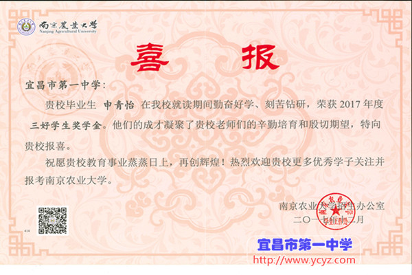 近日,我校收到南京农业大学发来的喜报。喜报称,我校2013届毕业生申青怡同学在南京农业大学学习期间,勤奋好学,刻苦钻研,荣获2017年度三好学生奖学金。他们的成才凝聚了宜昌市第一中学老师们的辛勤培育和殷切期望,特向我校报喜。