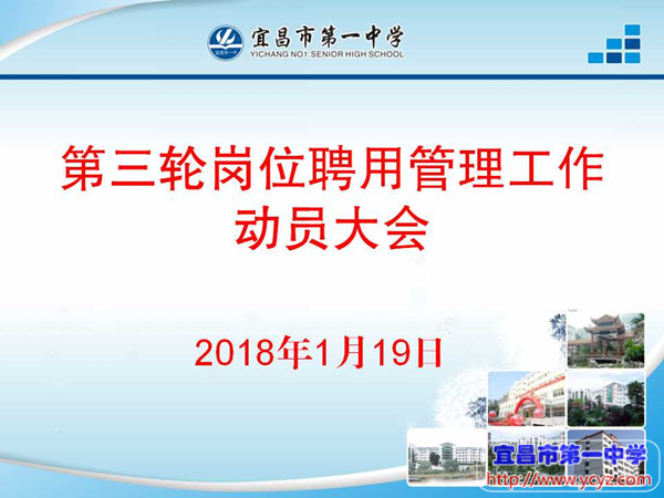 我校召开第三轮岗位聘用管理工作动员大会 2018-01-20 10:14:35 2018年1月19日,我校召开第三轮岗位聘用管理工作动员大会,校办副主任贺飚主持会议并对全体教师进行宣讲。 贺主任主要就《宜昌市第一中学第三轮岗位聘用管理工作实施方案》的定稿过程面对全体教职工进行了说明,反馈了市教育局对我校《实施方案》提出的修改意见,传达了市教育局对我校岗位职数核准情况,并对职数核准的依据做了详细解读,同时,他认真分析了我校专技岗位职数现状,让每一名教师做的心中有数,并对后期岗位竞聘工作需要注意的事项做了提醒。 本次岗位聘用管理工作动员大会,让老师们进一步熟悉了政策、了解了竞聘现状,为我校第三轮岗位聘用管理工作顺利开展奠定基础。
