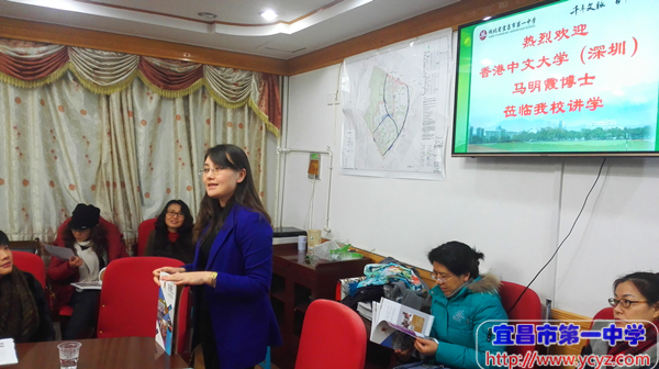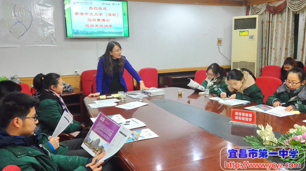 马博士首先介绍了香港中文大学(深圳)的由来,她表示,香港中文大学(深圳)是为了把香港中文大学50多年来优秀的办学经验、优良的师资队伍、先进的国际化理念以及严格的学术体系移植到内地而创办的一所公立大学,着眼于培养祖国未来二三十年最紧缺的双语创新型专业人才。随后,马博士从师资力量、专业设置、国际化程度、学生发展、报考方式、奖学金政策等方面详细介绍了香港中文大学(深圳)的基本情况,同时还介绍了宜昌一中2014届张昊东、王银、屈子皓,2015届瞿雪峰、江文婧等优秀毕业生在大学阶段的发展状况,对一中学子的高素质赞不绝口,也欢迎更多的优秀一中学子填报香港中文大学(深圳)。