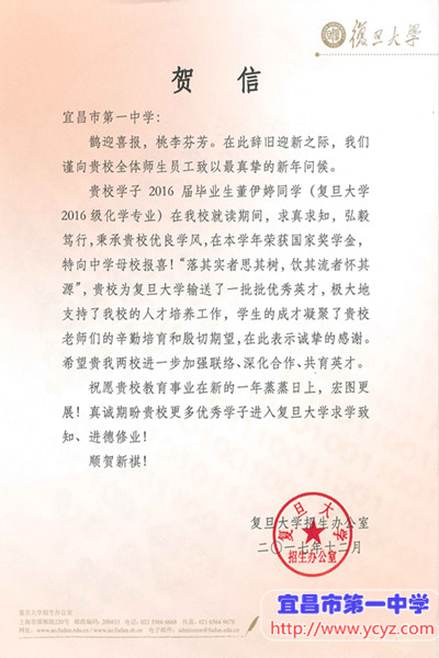 开学第一天,我校分别收到复旦大学、东北大学的贺信和喜报。来信称我校2014级范品钛、2015级王洋、2016级向鑫彦、董伊婷等同学在复旦、东北大学就读期间,求真求知、弘毅笃行,秉承宜昌一中优良学风,在本学年度荣获国家奖学金、国际大学生数学建模竞赛国际二等奖等,特向宜昌一中母校报喜!