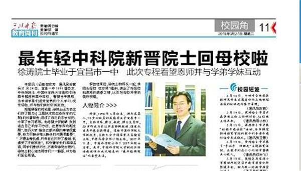 人物简介>>> 徐涛,1970年5月出生,湖北宜昌人,18岁以优异的成绩毕业于宜昌市一中。生物学家、博士、教授、博士生导师。30岁即成为长江学者特聘教授、国家杰出青年基金获得者。现任中国科学院大学副校长,生物大分子国家重点实验室主任,中德马普合作小组主任。2017年11月,中国科学院公布了2017年院士名单。其中,中国科学院大学副校长徐涛教授作为此次增选的 “最年轻新院士”而备受关注。