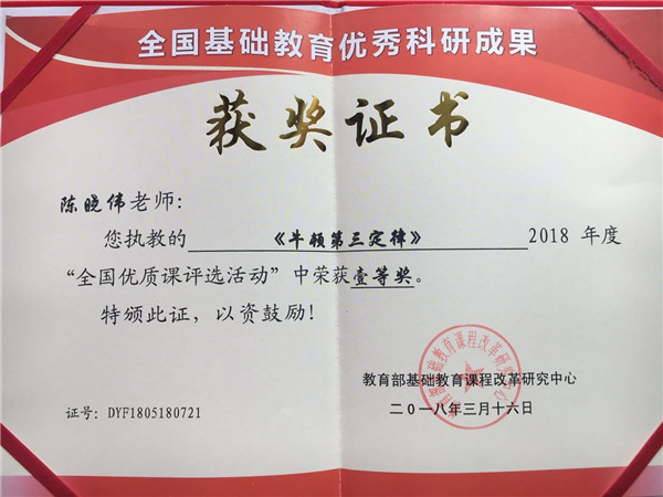 近日,从教育部基础教育课程改革研究中心传来好消息,我校物理教师陈晓伟在第七届全国中小学公开课电视展演活动——2018年度“全国优质课评选活动”中荣获一等奖。