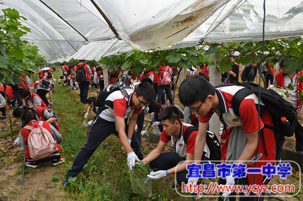 喂完鸭子,我们来到了葡萄园。葡萄藤上还是绿油油的一片,仅有一两粒不安分的青葡萄伴着露水露出头来。我们领取了塑料袋和劳保手套,弯腰在葡萄藤下当起了杂草清理工。葡萄架比较低矮,为了不影响葡萄的生长,我们不得不弯着腰穿梭于葡萄藤之间,腰酸背痛并没有阻挡同学们劳动的热情,神情专注又洋溢微笑的脸庞大概就是青春最美的模样了。