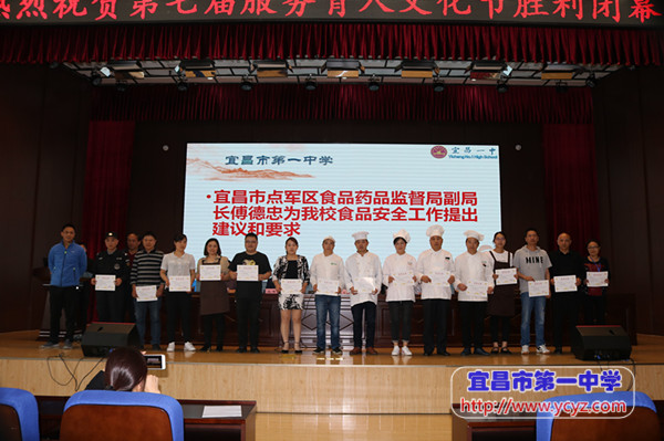 总务处副主任何金元宣读表彰文件后,在学工处潘琴主任优美激情的颁奖词中,学校对表现优秀的单位和个人进行了表彰。点军区食药局付德忠副局长即席讲话指出我校独具特色的服务育人文化节有实效有内涵有品位,学校工会郭永寿主席宣布第七届服务育人文化节胜利闭幕。出席闭幕式的学校领导还有分管后勤工作的刘克诚副校长。