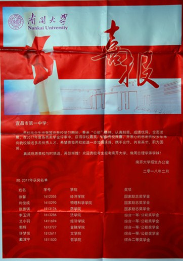 近日,南开大学给我校发来喜报。喜报称,我校毕业生徐馨、陈雨歌等在南开大学学习学校期间,秉承“公能”精神,认真刻苦,成绩优异,全面发展,在2017年度各类奖学金评审中,获得学校嘉奖,并衷心地感谢贵校多年来向我校输送多名优秀人才。