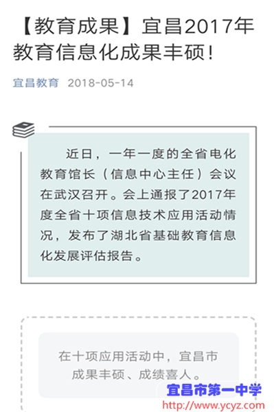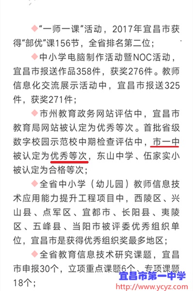 从刚刚结束的武汉全省电化教育馆长(信息中心主任)会议上所发布的基础教育信息评估报告了解到,在首批省级数字校园示范校中期检查评估中,湖北省宜昌市第一中学被认定为优秀等次。