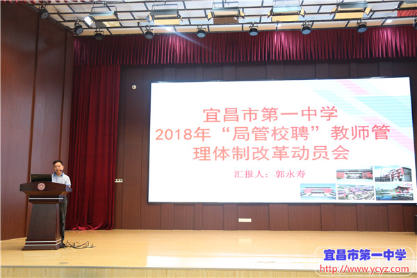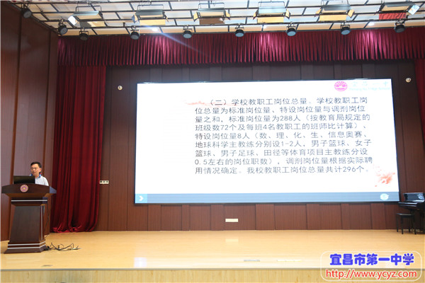 6月22日,我校召开全体教职工大会,工会主席郭永寿代表学校宣讲并解读《宜昌市第一中学2018年教职工聘任制实施办法》。