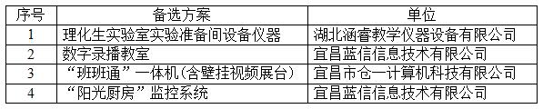 宜昌市第一中学于2018年6月25日对外发布征集新校区部分现代化教学设备设施建设方案公告。截止6月30日17:00,共有12家公司或厂家报名参加方案征集,经过学校16人评审小组认真独立评审,现将以下项目评审结果(备选方案)公示如下: