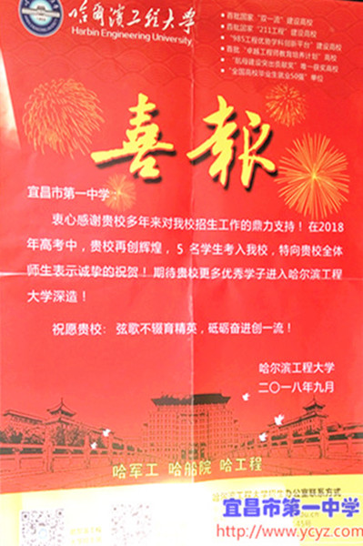 近日,我校收到来自哈尔滨工程大学发来的喜报。喜报祝贺我校2018年5位学子考入哈尔滨工程大学,同时期盼今后更多宜昌一中学子关注“哈军工、哈船院、哈工程”,报考哈工大。