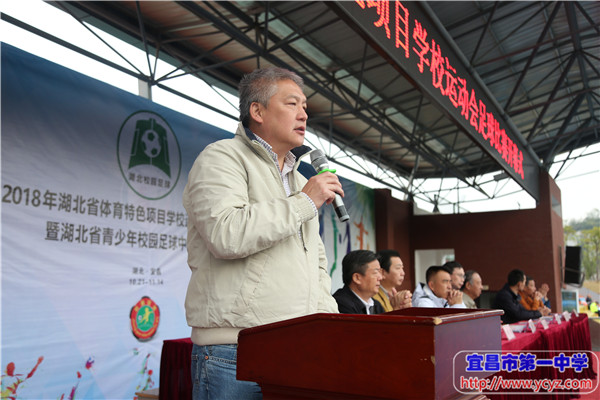 2018年湖北省体育特色项目学校运动会足球比赛开幕式在我校运动场隆重举行。出席本次开幕式的领导有:湖北省教育厅巡视员杨跃、湖北省体育局青少年体育处处长徐彦、湖北省教育厅体育卫生与艺术教育处调研员缪胜杰、宜昌市教育局调研员张金华、宜昌市教育局体卫艺科科长王书洲、我校副校长李大海、赛会裁判长周刚、武汉体育学院足球教研室副主任谢朝忠。来自我省各地区共33支代表队参与了本次盛会,我校校长付全新主持本次开幕式。
