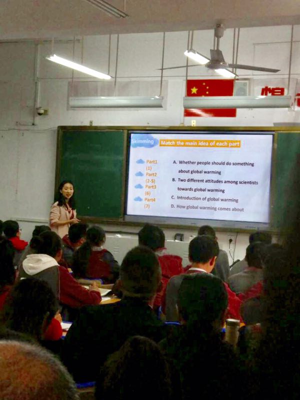 彭盈老师的参赛课题为Unit4 Book6 Global Warming Reading。课堂上,彭老师以旅行的青蛙为主线,带领学生探讨全球变暖的过程,并引导学生分小组演讲,以小动物的视角呼吁人类保护环境。彭老师以流利的英语口语、新颖的课堂设计、富有感染力的教态,为来自全市的观摩教师们留下了深刻的印象,得到了在场学生、评委和听课教师的一致好评,荣获一等奖。