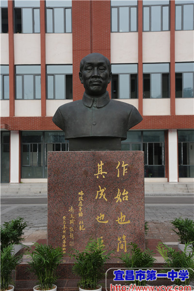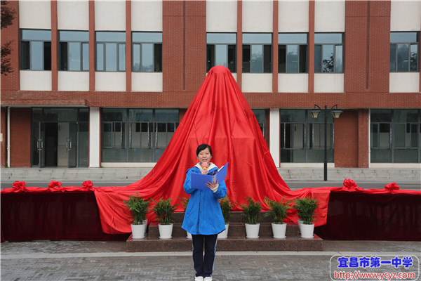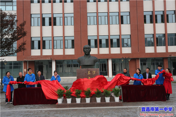 揭幕仪式上1720班刘柯尔发言,她首先回顾了董老与同盟会会员、时任我校教师的余祖言先生深厚的革命情谊,接着她号召全体新时代的青年应该传承前辈意志,与时代携手共进,向着远方更加灿烂的朝阳勇敢地进发,让五星红旗更加骄傲地飘扬!随后,党委书记陈鹏致辞。陈书记在致辞中详细讲述了董老与宜昌一中的渊源,同时他鼓励全体同学在新的历史时期,不忘初心,牢记使命,继续为实现中华民族的伟大复兴梦而努力。随后,与会领导、嘉宾与参与揭幕仪式的同学们前往董必武铜像前揭幕,并在铜像前合影留念。