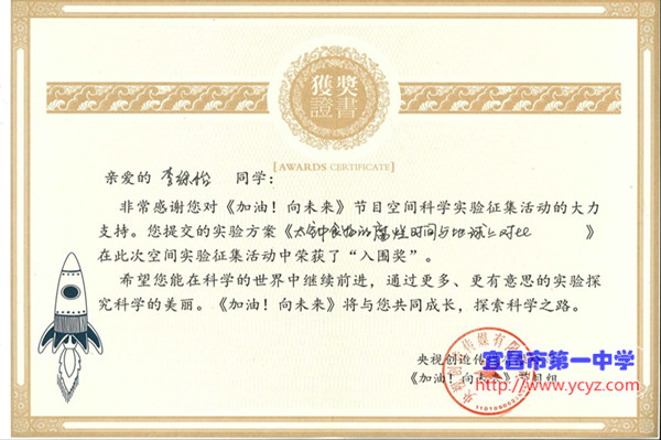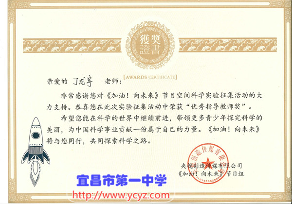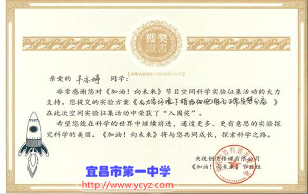 近日获悉,我校生物组奥赛教练丁龙宇老师与四位同学在中央广播电视总台央视综合频道面向全国中小学生开展的卫星搭载空间科学实验方案征集活动《加油!向未来》中分别荣获“优秀指导教师奖”和“入围奖”。