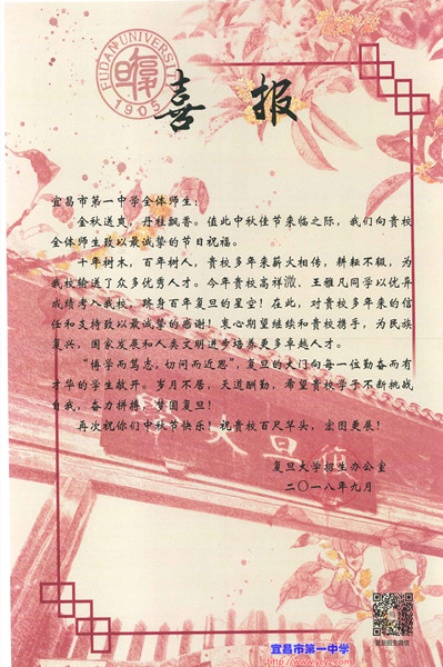 近日,我校收到复旦大学发来的喜报。喜报称我校2018级毕业生高祥澈、王雅凡同学以优异成绩考入复旦,终身百年复旦的星空。