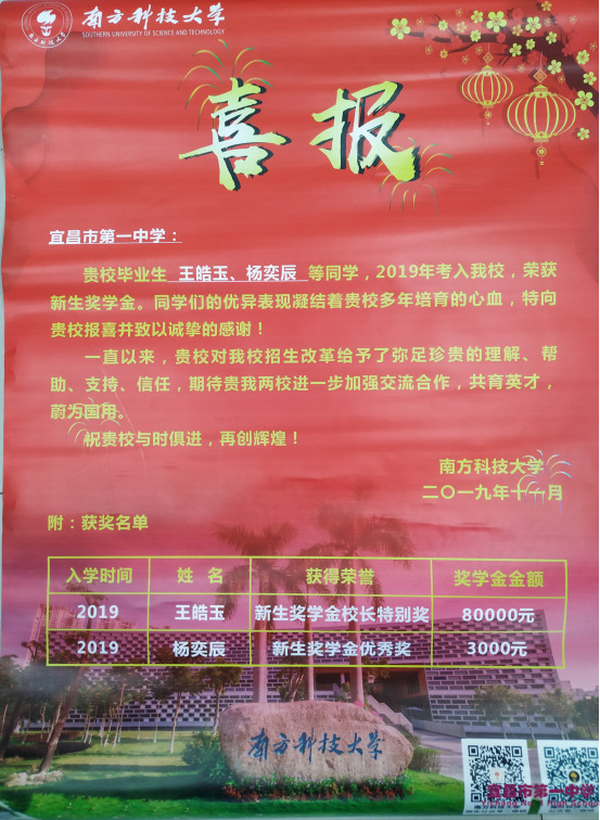近日,我校收到南方科技大学发来的喜报。喜报祝贺我校2019届毕业生王皓玉、杨奕辰等同学荣获新生奖学金。特此报喜!