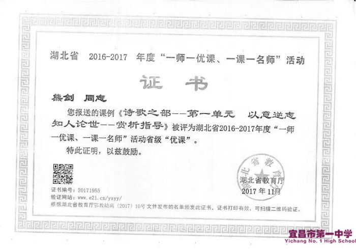 他积极参加各级各类教学竞赛,在每一次竞赛中打磨自己,收获了骄人的成绩。2016年获宜昌市“双读”优质课评选一等奖,2017年获宜昌市中小学青年教师教学竞赛一等奖、华中名校教学大比武一等奖、“一师一优课”湖北省省级“优课”、湖北省“长江教育杯”微课大赛三等奖,在2014、2018年两次主讲宜昌市第二轮高考复习研讨示范课。教学之余,积极参与了2个国家级课题、1个省级课题、1个市级课题的研究,并在国家级、省级期刊上发表教学论文两篇,辅导多名学生在圣陶杯、新世纪杯、创新杯等全国中学生作文大赛中获国家级一、二等奖。