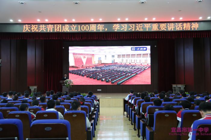 5月10日,庆祝中国共产主义青年团成立100周年大会在北京隆重举行。宜昌一中青年学生与部分教师代表在学校学术报告厅和各班教室,分别收看实况转播并聆听习近平总书记在庆祝大会发表的重要讲话。上午10点,伴随庄严的国歌声响起,墨池报告厅内青年学生全体起立,共唱国歌。随后,与会青年学生认真聆听习近平总书记在大会上发表的重要讲话。大会讲话中,习近平总书记回顾中华民族悠久历史中的青春色彩;论及百年来青年在党的领导下不忘初心,将自我命运与时代紧密相连的奋斗征程;肯定了奋斗征程中觉醒青年们蓬勃滚烫的青春力量。百年的征程,塑造了共青团坚持党的领导的立身之本,塑造了共青团坚守理想信念的政治之魂,塑造了共青团投身民族复兴的奋进之力,塑造了共青团扎根广大青年的活力之源。在实现中华民族伟大复兴的新征程上,习近平总书记给共青团提出了几点希望:第一,坚持为党育人,始终成为引领中国青年思想进步的政治学校。第二,自觉担当尽责,始终成为组织中国青年永久奋斗的先锋力量。第三,心系广大青年,始终成为党联系青年最为牢固的桥梁纽带。第四,勇于自我革命,始终成为紧跟党走在时代前列的先进组织。