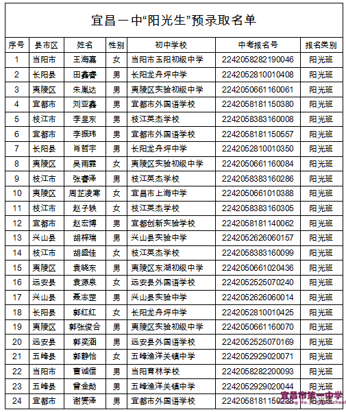 根据宜昌市教育局下发的《关于做好2022年城区综合高中特殊计划招生工作的通知》文件要求,现将2022年宜昌一中“阳光班”、“内尔班”预录取名单(按姓氏笔画排序)公示如下。公示时间:7月9日--7月11日,公示期内如有疑义,请致电:0717--6268770。