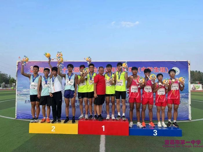 我校学生刘瀚文(右五)与其他三位队员为宜昌代表队斩获4×100米金牌