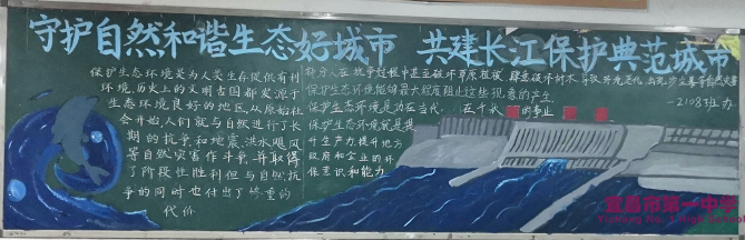 十一月是生态文明月,为了深入贯彻绿色发展理念,加深对母亲河长江的保护观,宜昌一中高一年级与高二年级的同学一同召开了“守护自然和谐生态好环境,共建长江大保护典范城市”的主题黑板报活动。