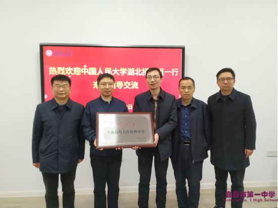 3月29日下午,中国人民大学湖北招生组卢志武博士和郝琦博士来到我校,为我校“生源战略合作伙伴中学”授牌。学校副校长高皓、教务处主任赵勇及高三年级副主任张有友参加了授牌仪式。