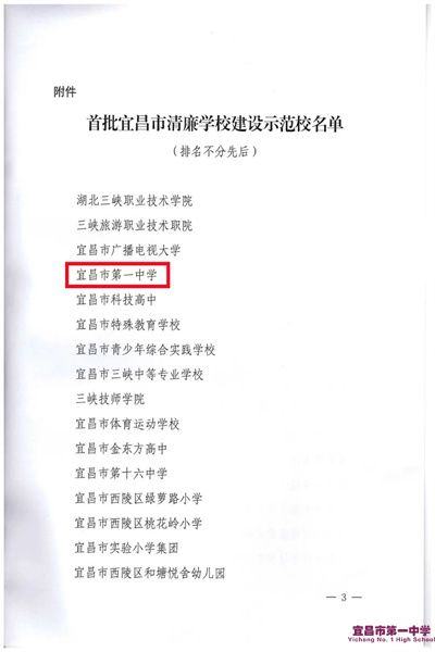 近日,宜昌市首批清廉学校建设示范校名单揭晓,我校作为市直两所高中之一榜上有名,全市共有72所大中小学荣此荣誉。