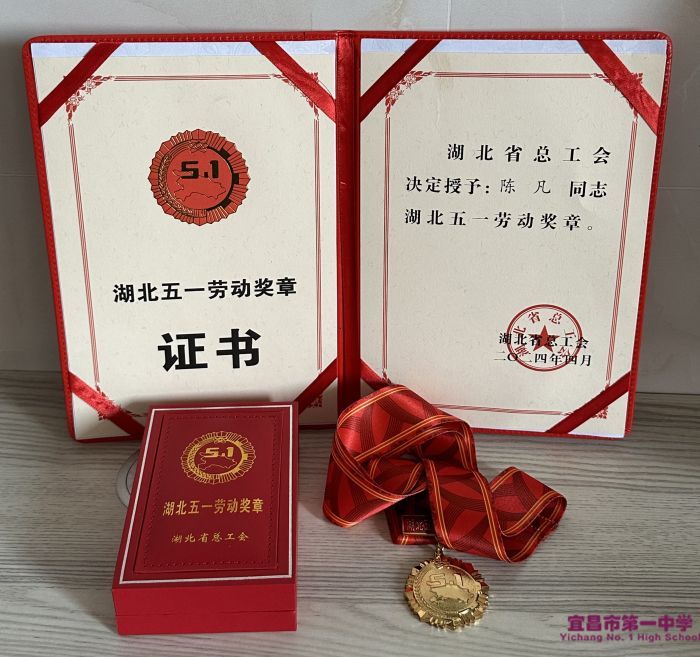 5月7日上午,阳光明媚,宜昌市总工会党组书记、常务副主席冯正宏,市教育局党组副书记黄赤蓉莅临宜昌市一中,给省五一劳动奖章获得者陈凡老师颁发证书和奖章。