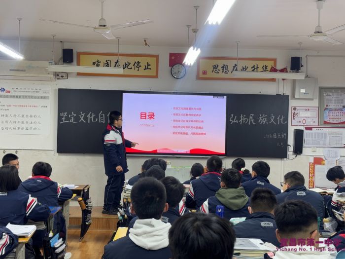1月5日,我校高一高二年级开展了以“坚定文化自信 弘扬民族文化”为主题的班会,旨在强化同学们对中华文化的了解和对民族文化的自信,培养家国情怀和责任担当。