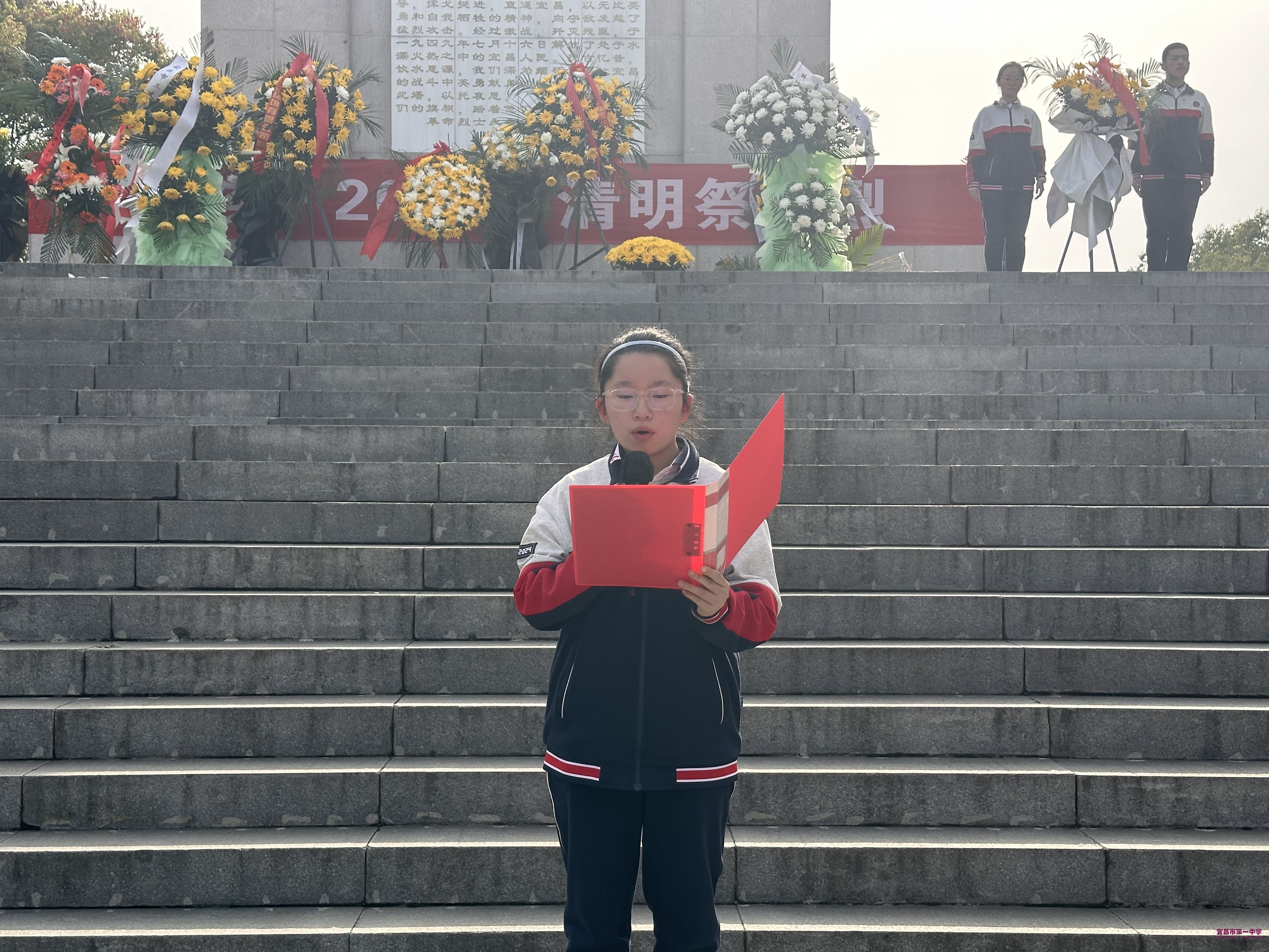 面对庄严肃穆的革命烈士纪念碑,2418班吴双同学在献词中动情地说道:“石牌保卫战的弹痕犹在纪念碑上,‘民生号’轮船的汽笛声仍回响于长江之上。作为新时代宜昌青年,我们定当守护好这江畔的万家灯火!”而后,校团委书记陈少文以“三问青年”引发深思:“面对英烈,我们是否传承了‘砍头不要紧’的信仰?面对时代,我们是否具备‘中流击水’的勇气?面对未来,我们能否交出无愧先辈的答卷?”传承先烈英雄志,一中师生永远在路上!