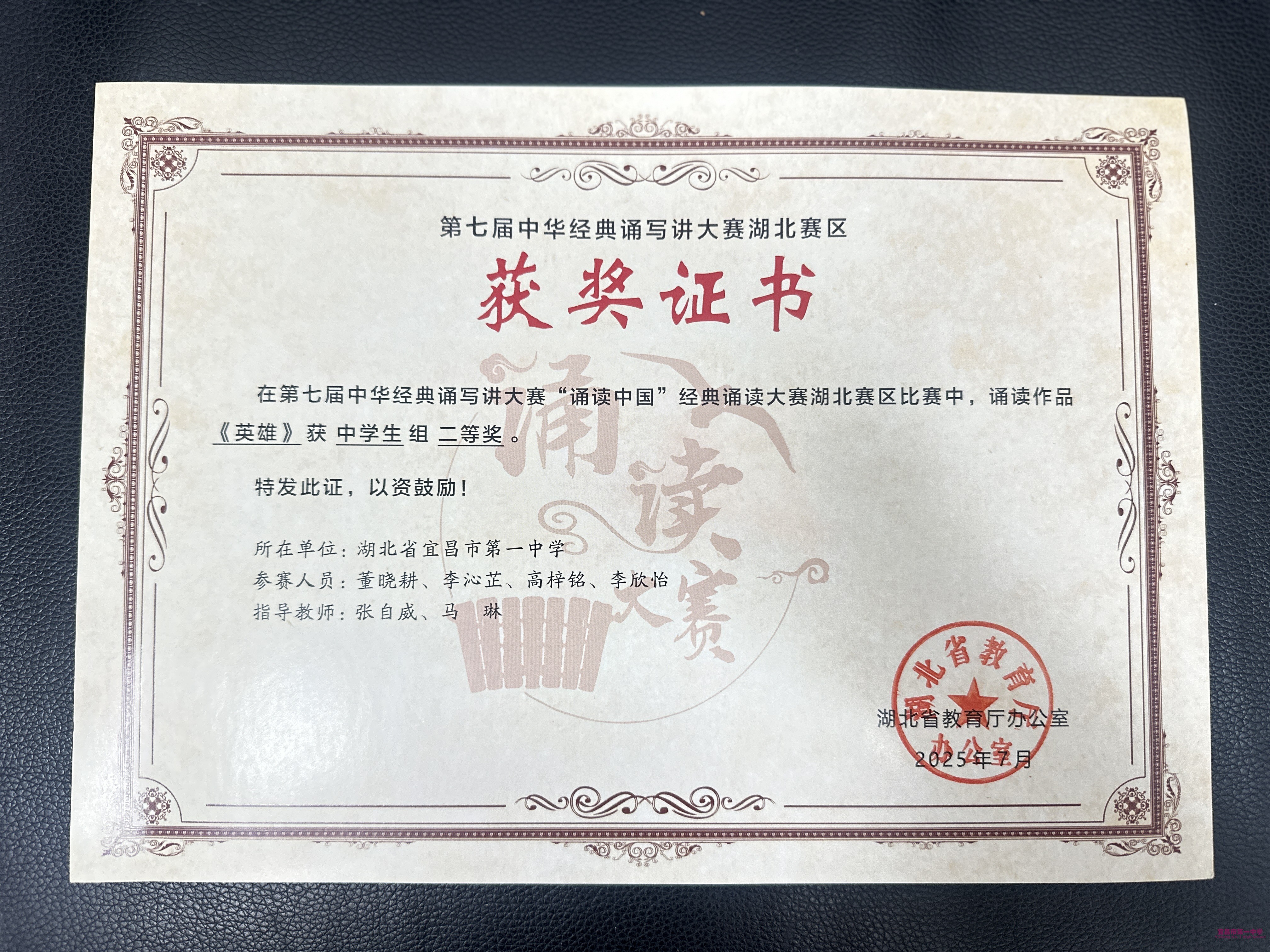 “诵读中国”经典诵读赛场,我校师生以声为笔,绘就文化长卷:学生团队2415班董晓耕、2303班李沁芷、2402班高梓铭、2410班李欣怡带来的《英雄》,以铿锵语调铺陈古今英雄的精神脉络,从“捐躯赴国难”的壮志到“吾辈当自强”的担当,将文字化作可感的精神共振,斩获中学生组二等奖,同时晋级国赛。指导教师张自威、马琳以舞台节奏与情感层次的雕琢,让诵读超越“读”的形式,成为“传”的纽带;教师团队黄傲鑫、张雪演绎的《美丽中国》,则以温润声线串联山河之美与文脉之盛,于舒缓韵律中传递文化自信,获评教师组优秀奖。