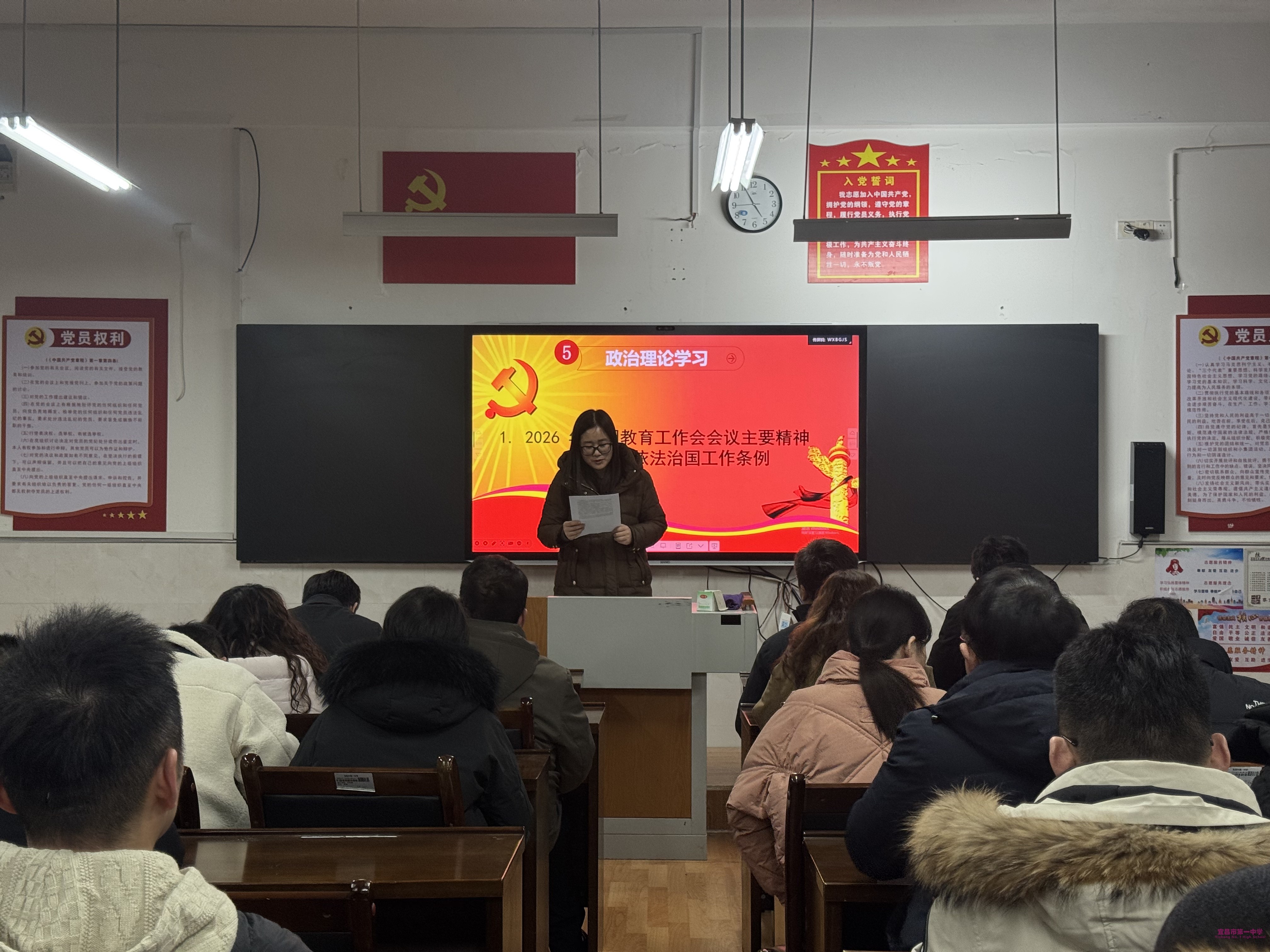 政治理论学习环节,谭玉园、彭盈带领全体党员集中学习了2026年全国教育工作会议主要精神及《中国共产党全面依法治国工作条例》,聚焦教育高质量发展与法治建设要求,明确新时代党员教师的责任方向。纪法教育在支部活动中,王苗郁领学近期违纪违法案例通报,通过以案为鉴,引导党员严守纪律红线,筑牢思想防线。