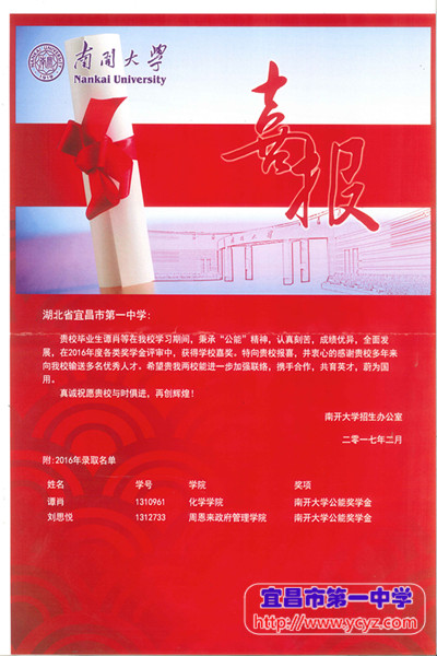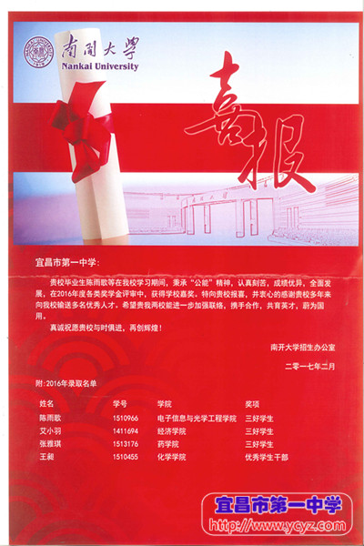 近日,我校收到南开大学发来的喜报。《喜报》称,我校多名毕业生在南开大学2016年度各类奖学金评审中,获得学校嘉奖。
